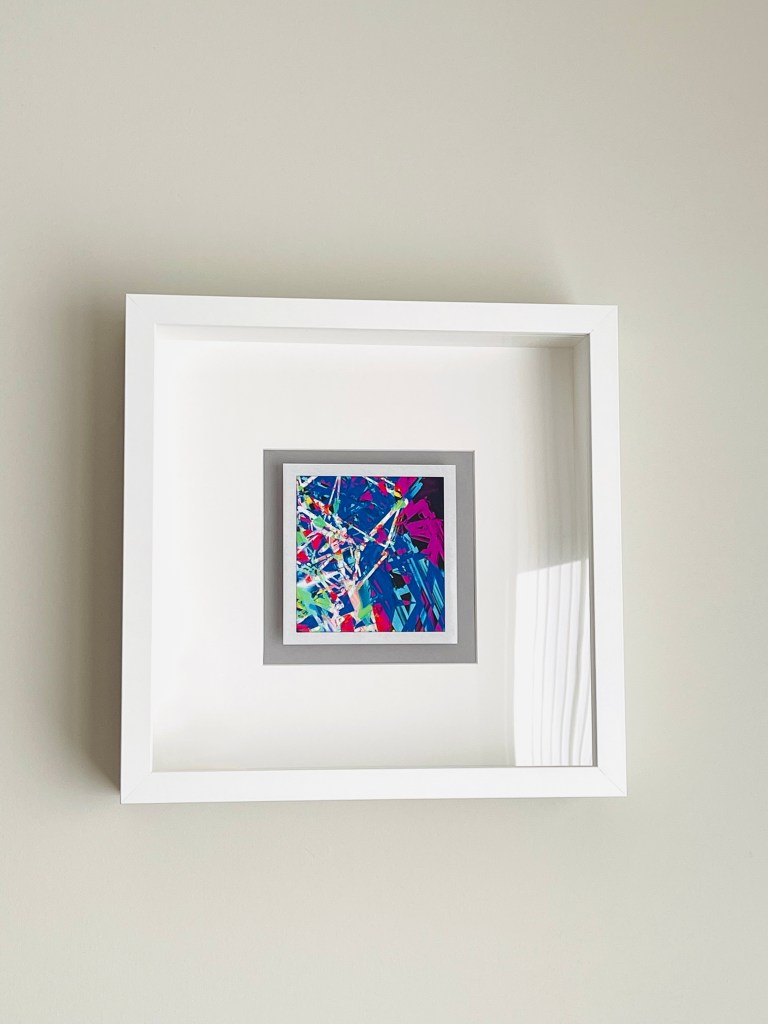 All of my pieces of art come in a custom white box frame – 10″ x 10″. The 3″x3″ Polaroid art floats in the frame. You can see a selection of my work below, the rest can be seen on my Instagram and Facebook pages which can be found on links here.